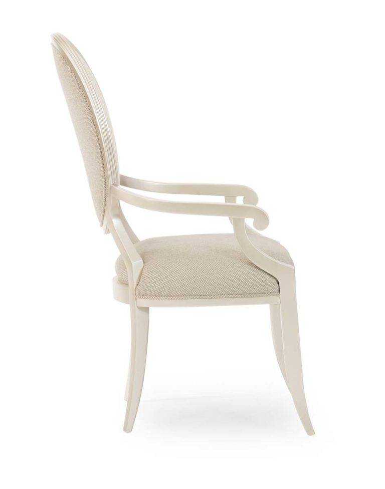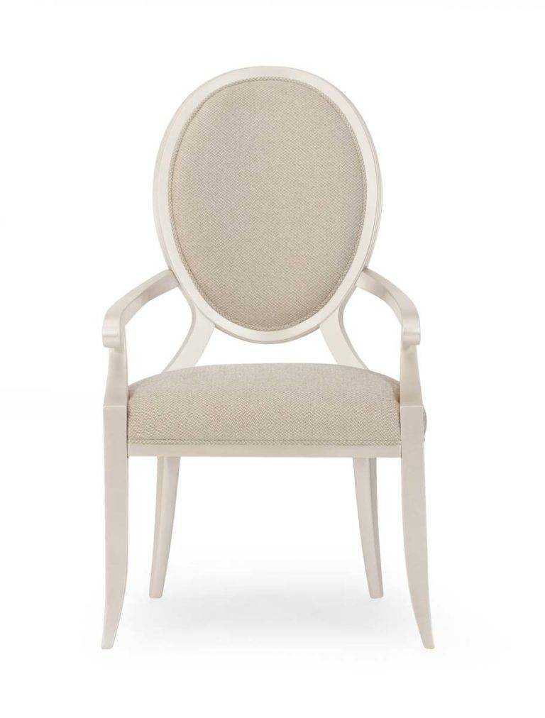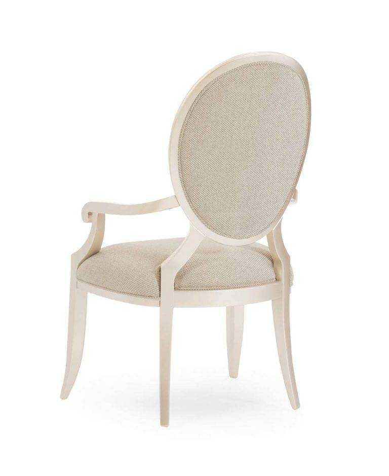 This dressy arm chair has an exposed wood frame that is finished in Soft Silver Paint. It surrounds an oval upholstered back and tight seat that are covered in a shimmering brushed tweed fabric in neutral tones. Tapered sabre legs enhance its classic appeal.