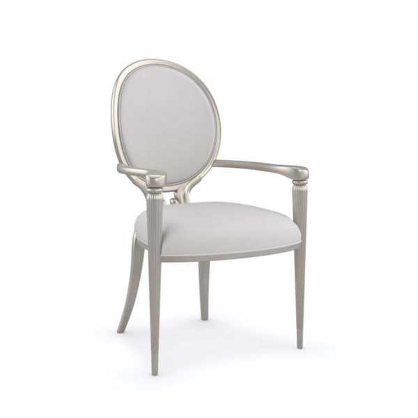 Drawing attention to the head of the table, this host arm chair makes an elegant dining companion. Dressed to impress and ease entertaining, its plush seat and inside back are tailored in a shimmering performance hobnail satin. A classic, oval-shaped back and outward curving arms are complemented by fluted front legs and back legs with a scroll detail for added embellishment. A contrast outback in lavender and gold cut velvet adds tactile appeal and a note of distinction.