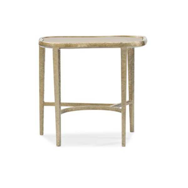 Just as jewelry enhances an outfit, every well-designed living space needs inspiring pieces that add drama and character. This elegant end table makes a statement in modern glamour with a rich mix of materials that includes a glass top tinted in a warm shade of brown supported by a cast-metal frame finished in a textured Lucent Bronze Metallic Paint. The organic form and unique texture of this Contour table brings movement into the occasional setting while anchoring it in style.