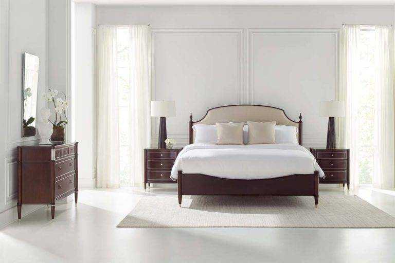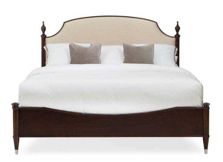Fall asleep with ease each night in this magnificent bed and enjoy the royal treatment. Notable in every way, its defining style bridges old and new with an exquisitely upholstered fabric headboard framed in a rich Mocha Walnut finish. Boasting a traditional silhouette, this elegantly updated creation offers incomparable fit and finish. An acrylic post option is available while metal ferrules in Stainless Steel on the front legs add an extra element of glamour. With classic heritage and refreshing nuances, it?s the just type of bed you can?t wait to come home to.