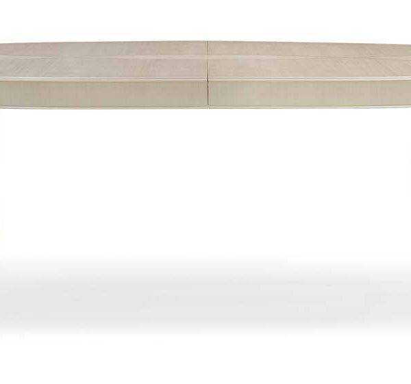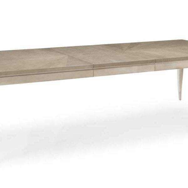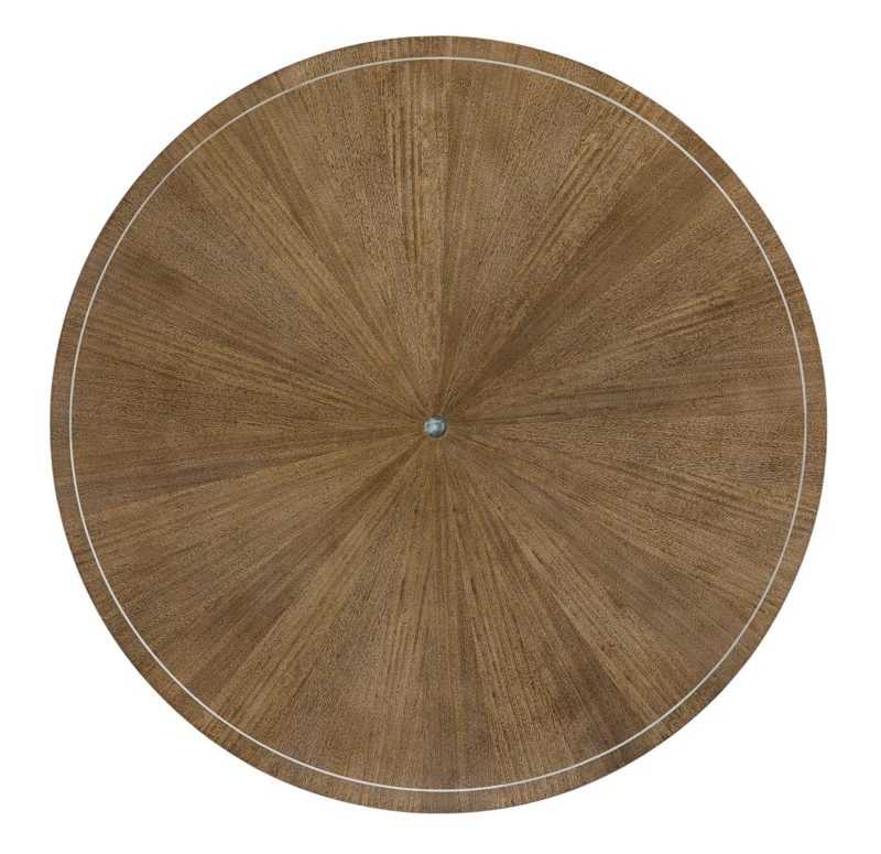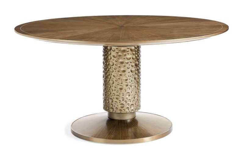 Creating a dining space with incomparable style is easier than ever with this chic table. Its one-of-a-kind top is crafted of radial-matched eucalyptus highlighted with a Dappled Mink finish, a silkscreen pattern in Warm Reflections and an exquisite Mother of Pearl inlay. A lustrous Warm Reflections finish highlights its shapely Art Deco-inspired pedestal. At its base, a plate mirrors the radial-matched eucalyptus in Dappled Mink from above and is outlined with a plated-metal band in Champagne Gold.