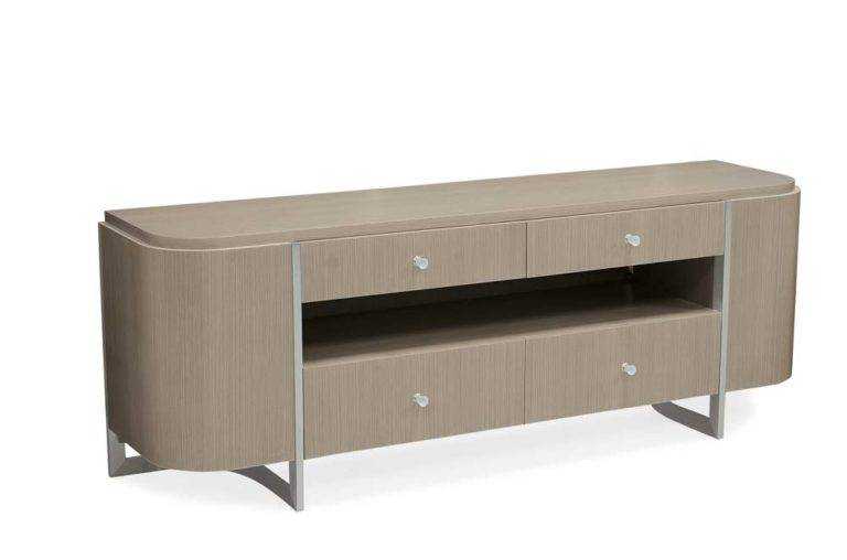 Case finished in Serene Dark Taupe. Metal base frame integrated into the case and finished in Brushed Stainless. Four drawers, top drawers with side guides and bottom drawers with undermount soft-close guides. Drawer interiors in Almost White. Frosted glass door knobs.