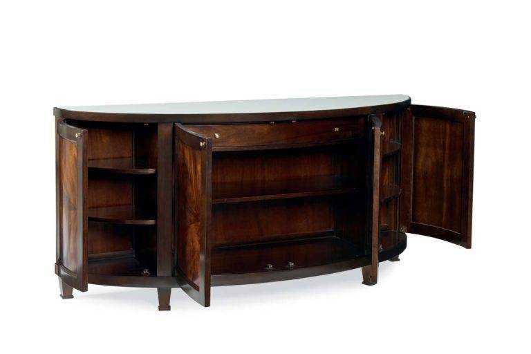 This stylish demilune is not just for the dining room anymore! Contemporary living is all about designing your spaces for the lifestyle you live. In Glowing Terms is a sophisticated storage piece that will be a welcome addition to any room in which you love to entertain. A tone-on-tone mix of finishes gives this four door sideboard a contemporary vibe. The doors feature a beautiful flamed mahogany veneer finished in Go With The Grain while the case features our rich, dark Espresso Bean. The top is the real showstopper! It’s fitted with frosted glass that is illuminated by a line of LED lights that outline the piece’s curved silhouette. Keep silver clean and organized in a felt-lined drawer located behind the two center doors.