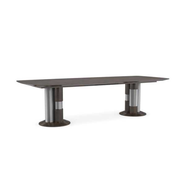 Этот  приставной обеденный стол сочетает в себе мягкий блеск металла и естественную красоту дерева.  Минималистическая столешница большого размера с четкими линиями и скошенным фартуком балансирует на ножках пьедестала, каждая из которых состоит из трех стилизованных колонн из сепии и дымчатой нержавеющей стали.  Идеально подходит для развлечения и размещения дополнительных гостей, он удобно размещяет  во круг себя 12 человек .