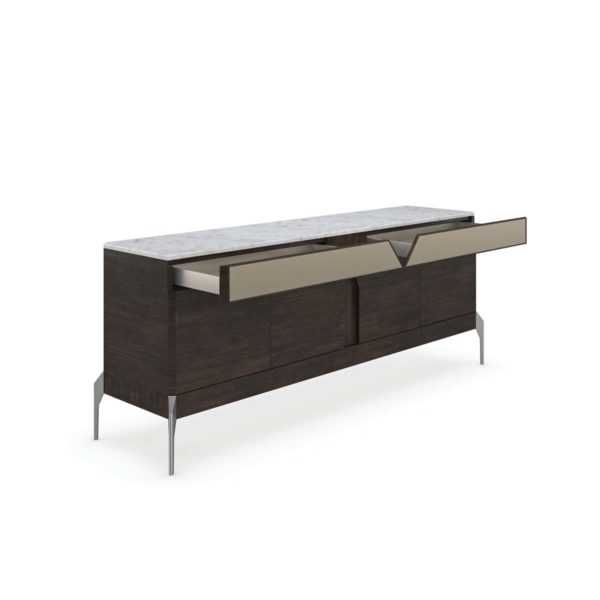 Вдохновленный минималистической элегантностью итальянского современного дизайна, этот буфет производит яркое впечатление благодаря изысканному сочетанию материалов и отделки. Зеркальная бронза придает выдвижным ящикам привлекательную изюминку, сочетающую в себе функциональность и дизайн. Богатая отделка Sepia подчеркивает красоту шпона Paldao, резко контрастирующего с роскошной столешницей из каррарского камня.  Дверцы шкафа открываются с сенсорной защелкой снаружи, обеспечивая достаточно места для хранения посуды, белья и других предметов.