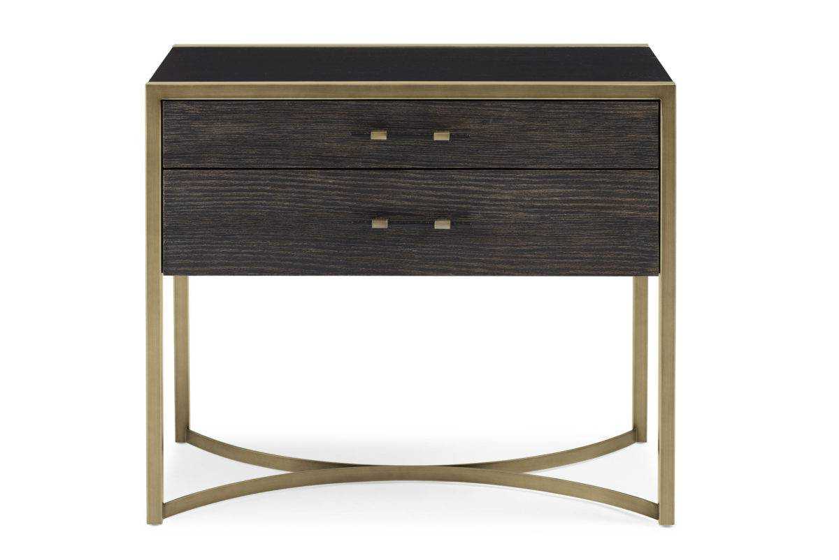 This boldly styled nightstand makes an unforgettable addition to any statement bed. Its clean-lined profile is paired with a shapely metal base created by two half circles. With its medley of Cerused Oak, Black Stained Ash and Bronze Metallic Paint finishes, this bedside essential feels both classic and style-forward. Two drawers complete its appeal and are perfect for storing a few of your favorite things as well as keeping your master retreat clutter-free.