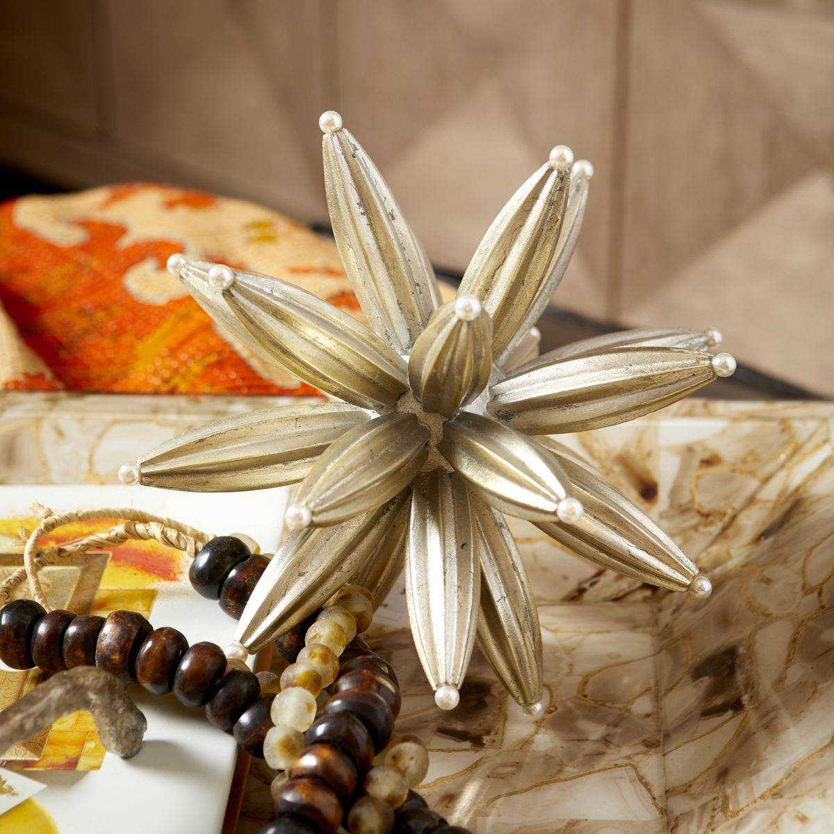 Torpedo-shaped arms emerge in every direction from the center of this small Smithstar sculpture. A delightful addition to a bookcase motif, the sculpture features a silver finish that glimmers in the light.