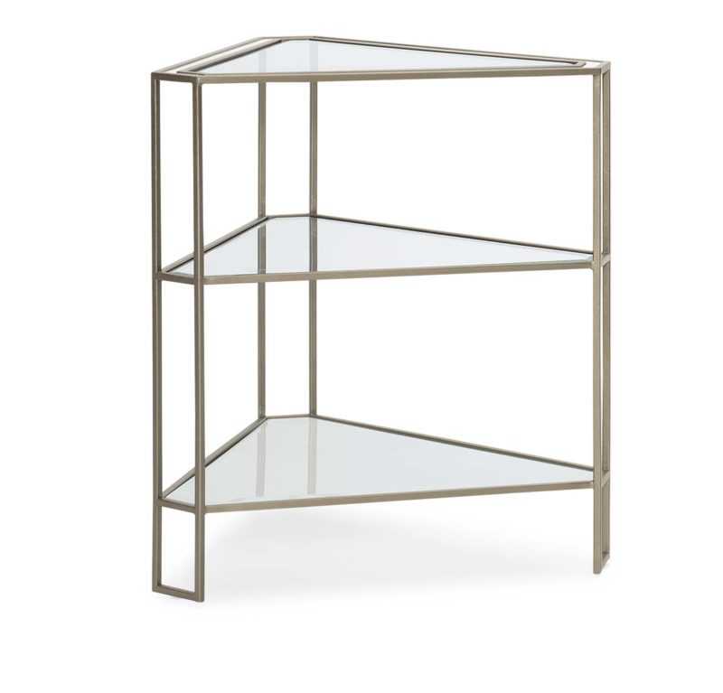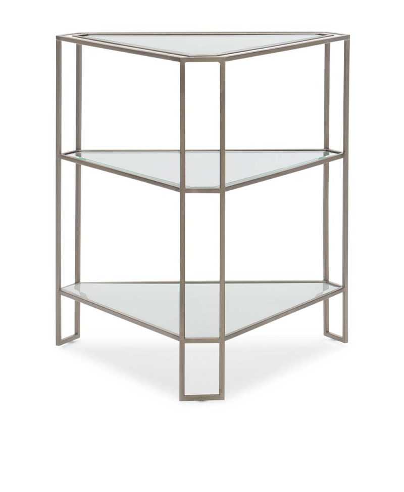 Sure to take center stage, this triangular side table is charming from every angle. Its open design features a timeless combination of metal and glass with highlights of pure white. A unique triangle shape (with thoughtfully considered notched corners) makes it perfect for connecting spaces and bringing new energy to rectilinear sofa and chair arrangements. Three open shelves include a substantial layer of ?-inch beveled glass while its entire silhouette is highlighted in a Sundance Gold finish. The elegant addition of white inlay outlines the top rim of this table while the open bottom shelf below features a coordinating element of tempered glass that has been back-painted in white. From every perspective, this signature piece imparts a character that?s light, elegant and refreshing.