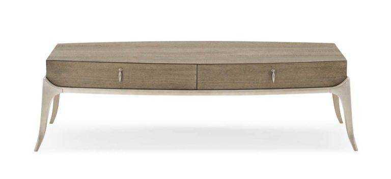 This cocktail table is full of visual variety. The top case is Quartered Ash veneer, finished in Elegant Linen. The bottom corners of the case are curved, making for a dramatic presentation. Delicate custom metal hardware adorns two drawers, finished on the interior in Pearl, for magazine and remote control storage. The case rests on a platform with graceful tapered sabre legs, all painted in Soft Silver Leaf.