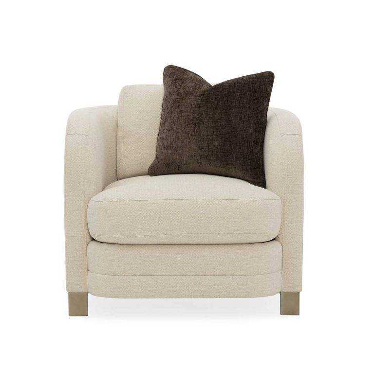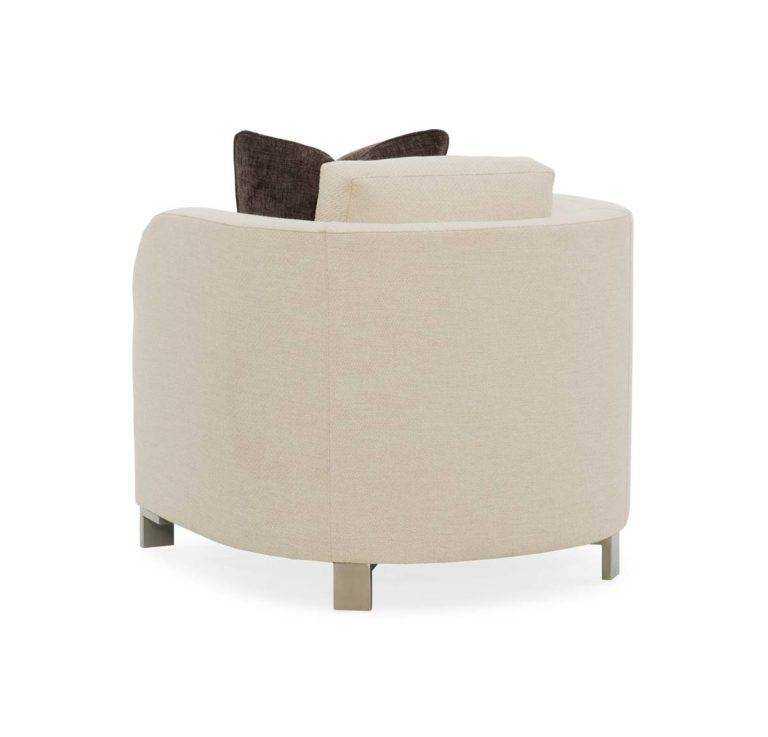 This stylish chair is low and modern with curvy appeal. Fully upholstered in a textured, creamy basketweave fabric, its frame is refined and curving, with beautiful tailoring to afford smooth, rounded edges. A soft chenille throw pillow in a deep espresso shade adds just the right contrast. The piece is finished with low Smoked Bronze metal feet.