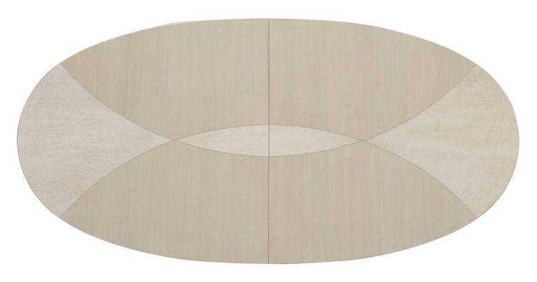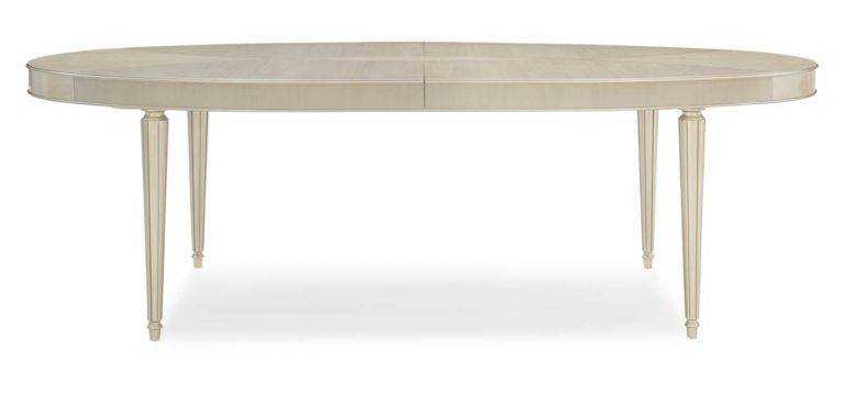 Ready for another reason to invite friends over more often and host the holidays? This spectacular dining table will reignite your passion for entertaining with its exquisite top crafted of Smoked Birdseye and Thunder highlighted with an intricate silkscreened pattern in Soft Silver Paint. Its apron extends the unique look with more artful pattern embellishment while its tapered legs in Soft Silver Paint boast metal ferrules in Lightly Brushed Chrome. Substantial in size at 90 inches, the soft finishes of this table render it light in presence?giving you unlimited decorating possibilities. Add its three 22-inch leaves (the third leaf features a center leg for support), and you?ll have a 156-inch table?enough to seat 12 of your favorite people.