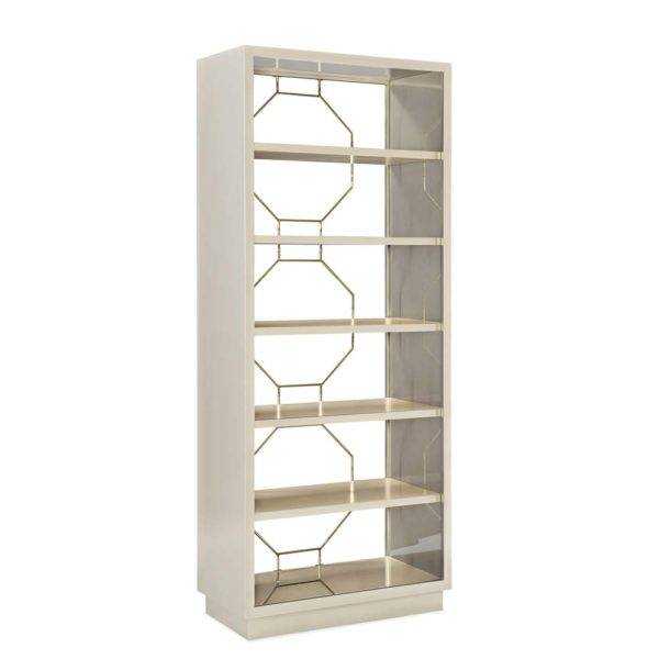 Create a polished vignette and add another layer of elegance to your room with this eye-catching etagere. Open and airy, its dreamy appearance features an all-over Soft Silver Paint enhanced with a metal fretwork back in a bamboo motif accentuated with Whisper of Gold. Back-painted glass in a Taupe Metallic distinguishes the interior of this five-shelf display piece. Drawing inspiration from classic Chippendale style, this etagere can be used on its own for storage and display or bunched together to make a bold design statement.