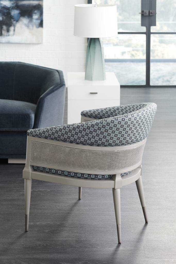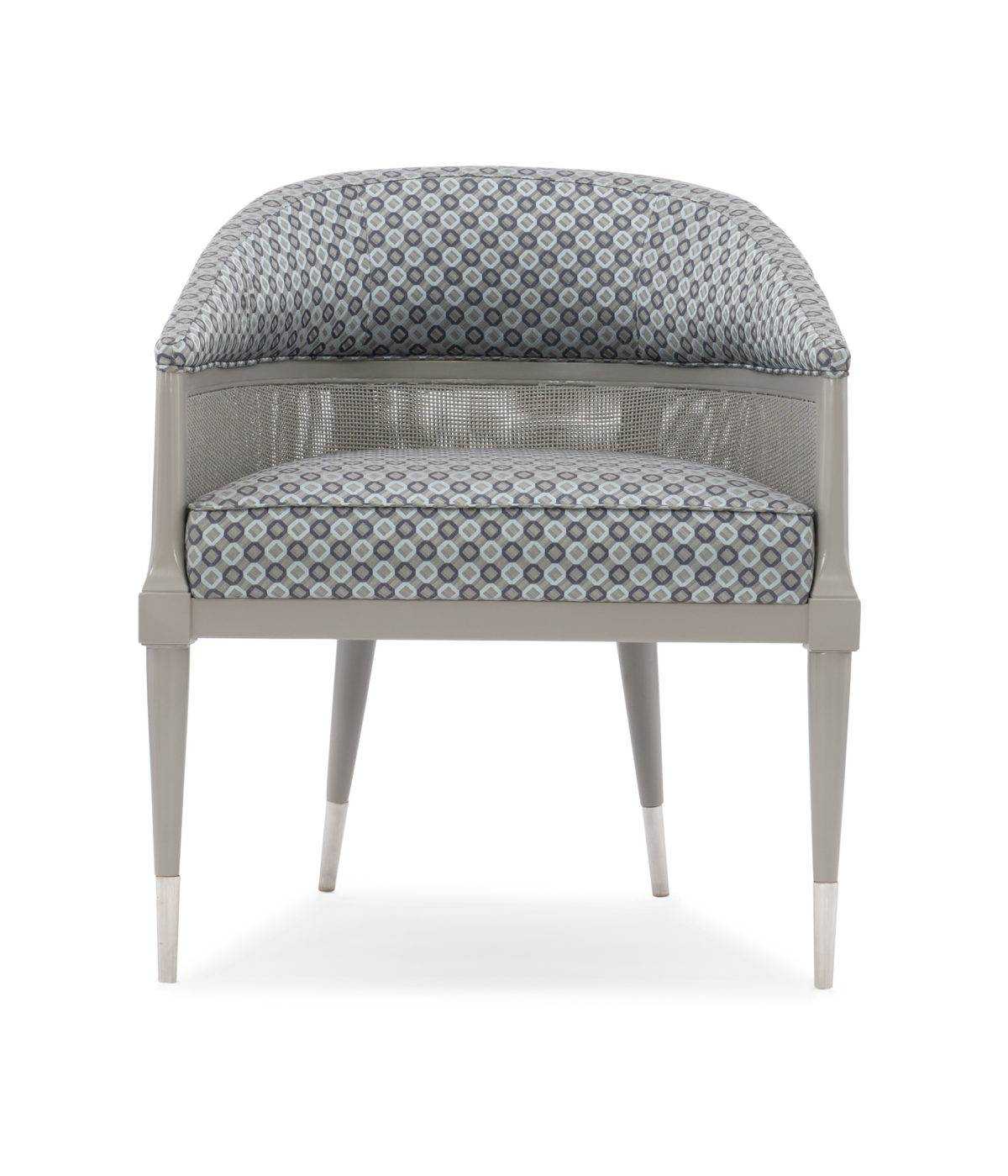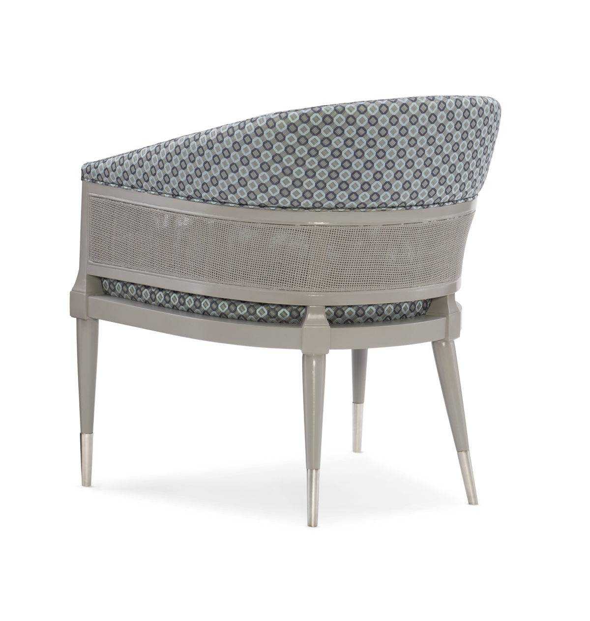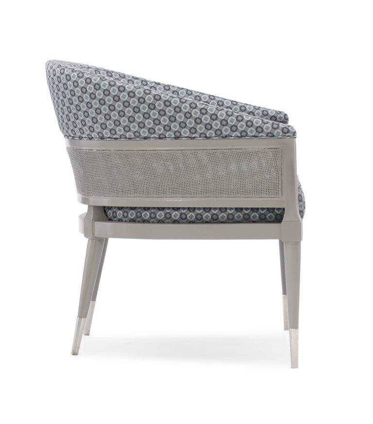Offering a mix of modern elements-fabric, rattan, wood and metal-the Narration Chair is the epitome of modern style. Reflecting the trend of blending organic materials in modern settings, this distinctive chair boasts a belted trim of painted rattan around its curved inside and outside back. Metal ferrules in Modern Nickel add a reflective touch to its tapered legs to complete the aesthetic.