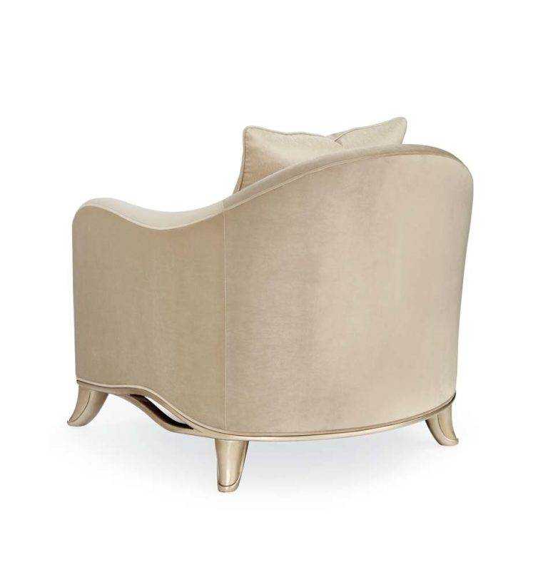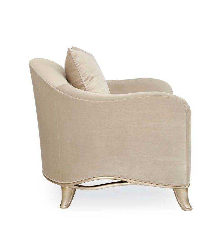 Elegantly enrobed in velvet, this chair has a soft curving back and arms that are a welcoming respite after a long day. Wrapping around the base of the chair is the collection’s delicately carved ribbon detail in a soft Gold Bullion Leaf finish. The chair is suspended off the floor on rounded trapeze feet. Lovely and refined, The Ribbon Chair is a perfect addition to any room.