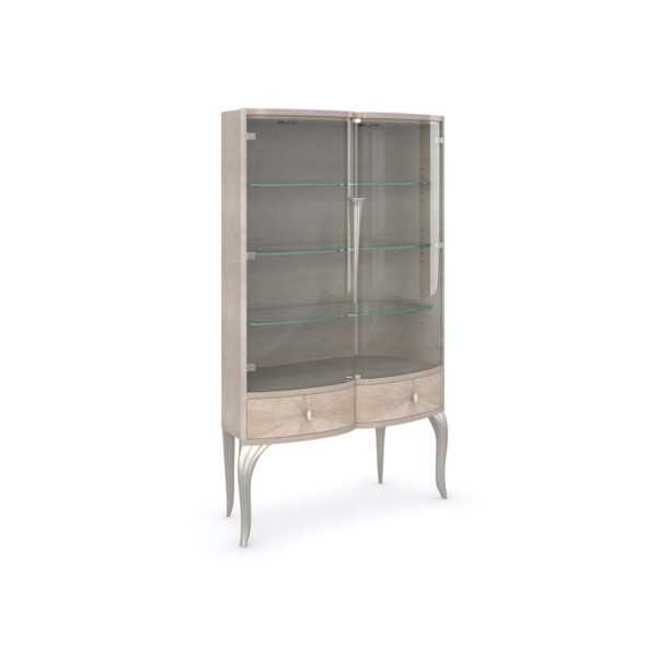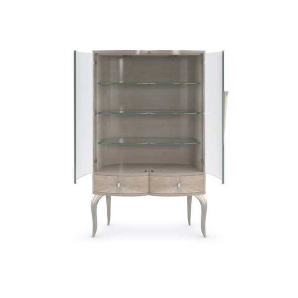 Instantly elevating, this shapely, glass-door bar cabinet mixes beauty and functionality for a versatile style that?s reflective of the Art Deco era. Light-toned finishes showcase the exquisite woodgrains of koto and figured sycamore veneers, balanced by the warm glow of Soft Radiance paint. Features a lit interior with three adjustable glass shelves for storing spirits or collectibles. Two drawers offer additional space for keeping linens and other entertaining essentials.