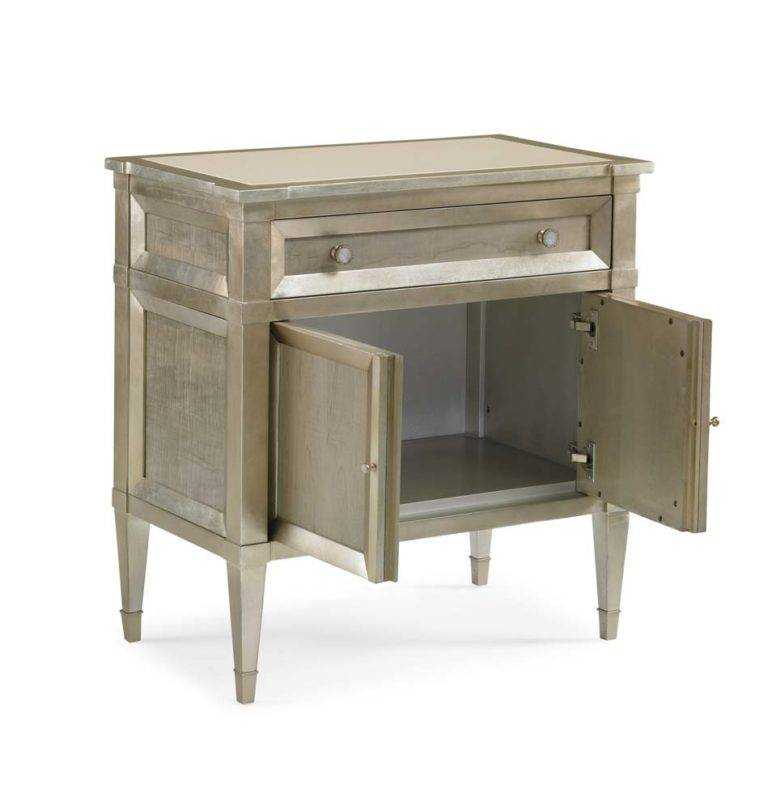 That’s Italian for ‘good night’, and it’s our name for this sweet closed storage piece, designed with the Ննջասենյակ in mind. There’s one drawer, and a pair of doors to hide away your night-time reading. The natural patterns in highly figured Tiger Maple veneer – used on the drawer fronts and case sides – are allowed to shine through our soft, Smoke grey finish. For the frame, we used a Taupe Silver Leaf application that we think results in a stunning combination. We added our favorite creme stone top, too, the perfect landing for your cup of morning java, and sparkly, jewelry-like hardware for the drawers. Next to your bed, Buona Notte is a beautiful way to start or end your day. Marry up Buona Notte with Italian Dressing, if you cannot get enough of this beautiful finish.