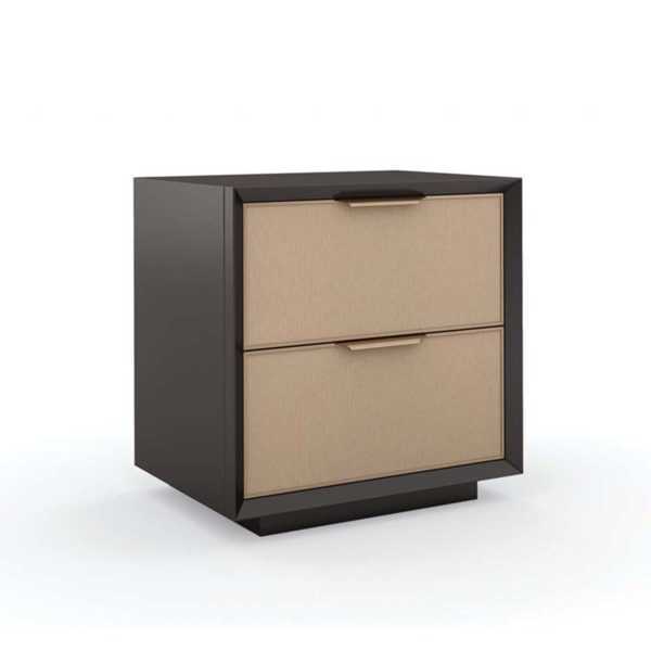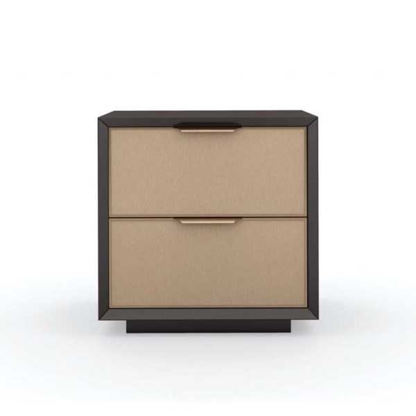 Euro-modern inspired bedside storage introduces a refined mix of materials and finishes. Encased in Dark Chocolate, two deep drawers feature durable vinyl fronts, embossed in a rivulet pattern reminiscent of rain trickling down a windowpane. Champagne Gold drawer pulls and metal trim add warmth and an artful accent. Balanced on a plinth base, this clean-lined design works well in living and bedroom interiors.