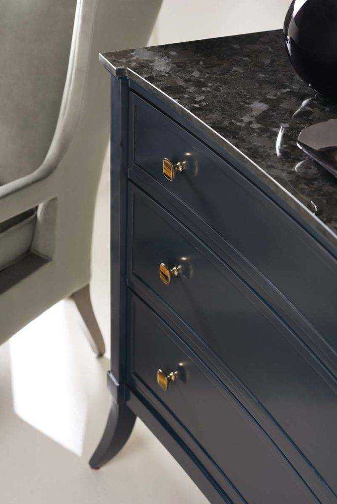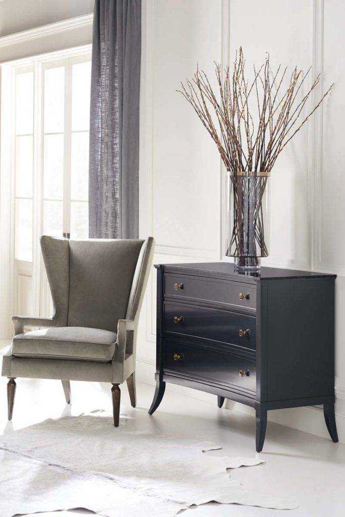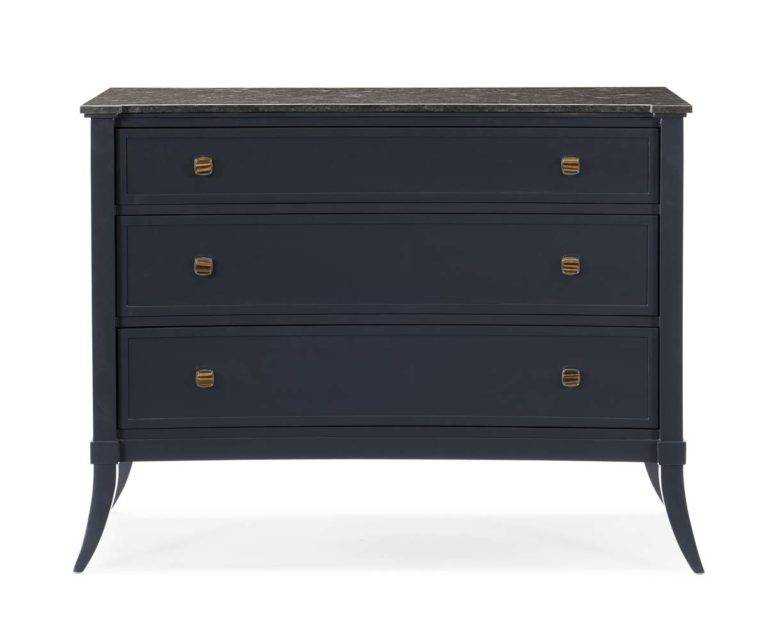 You won’t want to overlook this seemingly simple chest. From a distance, it has a traditional, rectangular appearance, with clean carving and flared sabre legs. But look past the Iron Ore exterior to discover its ever so slight concave front, lustrous dark stone top and gleaming Tiger Eye hardware. Three soft-closing drawers afford ample storage for a hallway or living room.