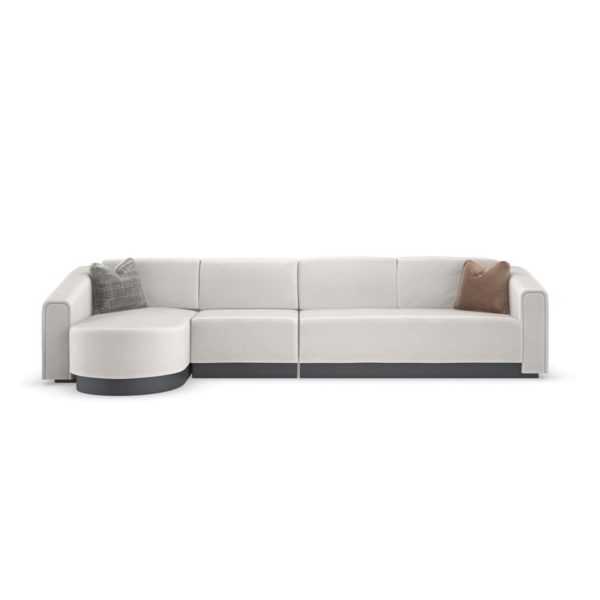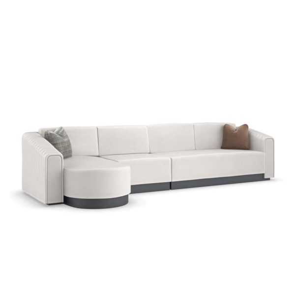 A minimalist design with distinct Euro-modern style, this four-piece sectional is architectural, yet softly rounded for a luxurious lounging experience. Expertly tailored in a brushed twill performance fabric, it features a quilted channel detail along the outback and arms, with inset front panels for added flair. Boxed accent pillows bring a pop of color, contrast, and pattern. Adding depth and dimension: a recessed plinth base in a rich Iron Ore finish.