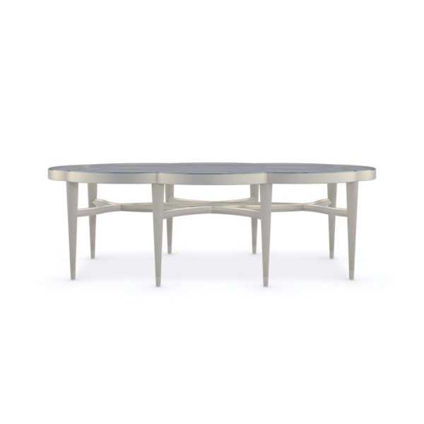 With an embellished oval-shape, the Lillian cocktail table adds a glamorous focal feature to seating areas. Framed in Soft Radiance-painted wood, an inset glass top reveals an intricate, intertwining pattern linking its slender fluted legs. Pairs perfectly with the Lillian end table.