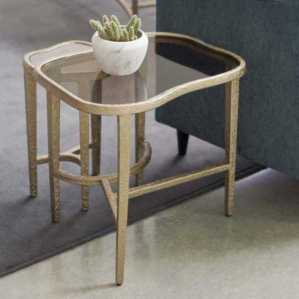 Make friends with a side table that successfully inserts itself into almost any situation or decor setting. A matte metallic, Taupe Silver Leaf interacts nicely with light and dark wood finishes, other metals and upholstered fabric combinations. A glass top and mid-level glass shelf show off the table?s distinctive interconnecting patterned top and lower stretcher.