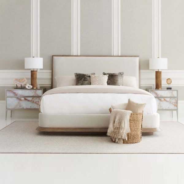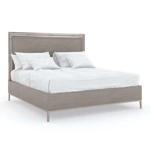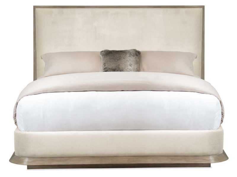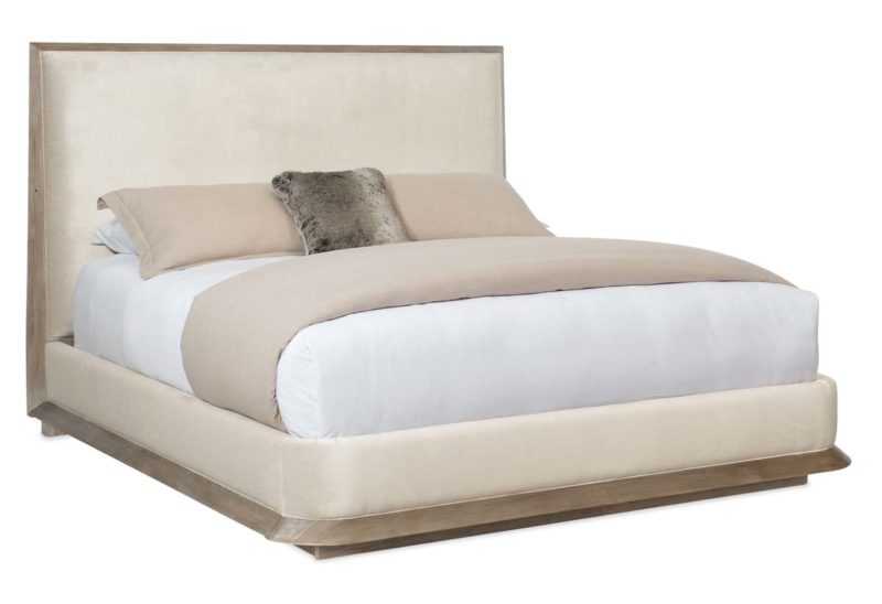 Elegant simplicity starts here. With every detail thoughtfully considered, The Stage is Set bed embodies the new look of inspired luxury. Its tall upholstered headboard is tailored to perfection in a stunning neutral fabric and outlined in a wood frame. An easygoing Ash Driftwood finish highlights the headboard?s wood trim and the platform base of this impressive creation. Classic in every way, this is th