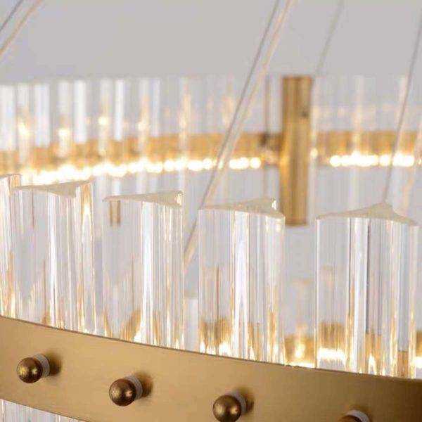 If you are looking for a Deco influenced chandelier then look no further. The circular frame with antique brass finish is inset with frosted glass rods and just waiting to reflect the light in a hundred different ways. The ring can be hung in any desired position by adjusting the length of the cables. Ideally suited to modern and 1920s and 1930s homes.